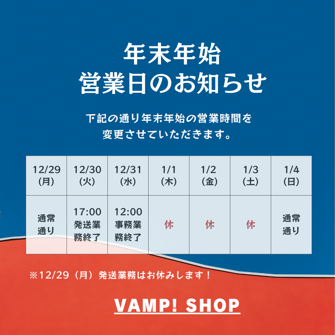 VAMP! SHOPはオンラインショップですので、お休み中もいつでもオーダーしていただけます。年末年始もお待ちしています。年内に新入荷アイテムも掲載する予定です。お楽しみに。